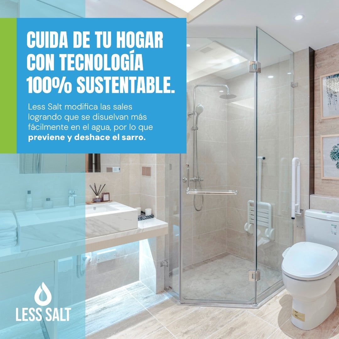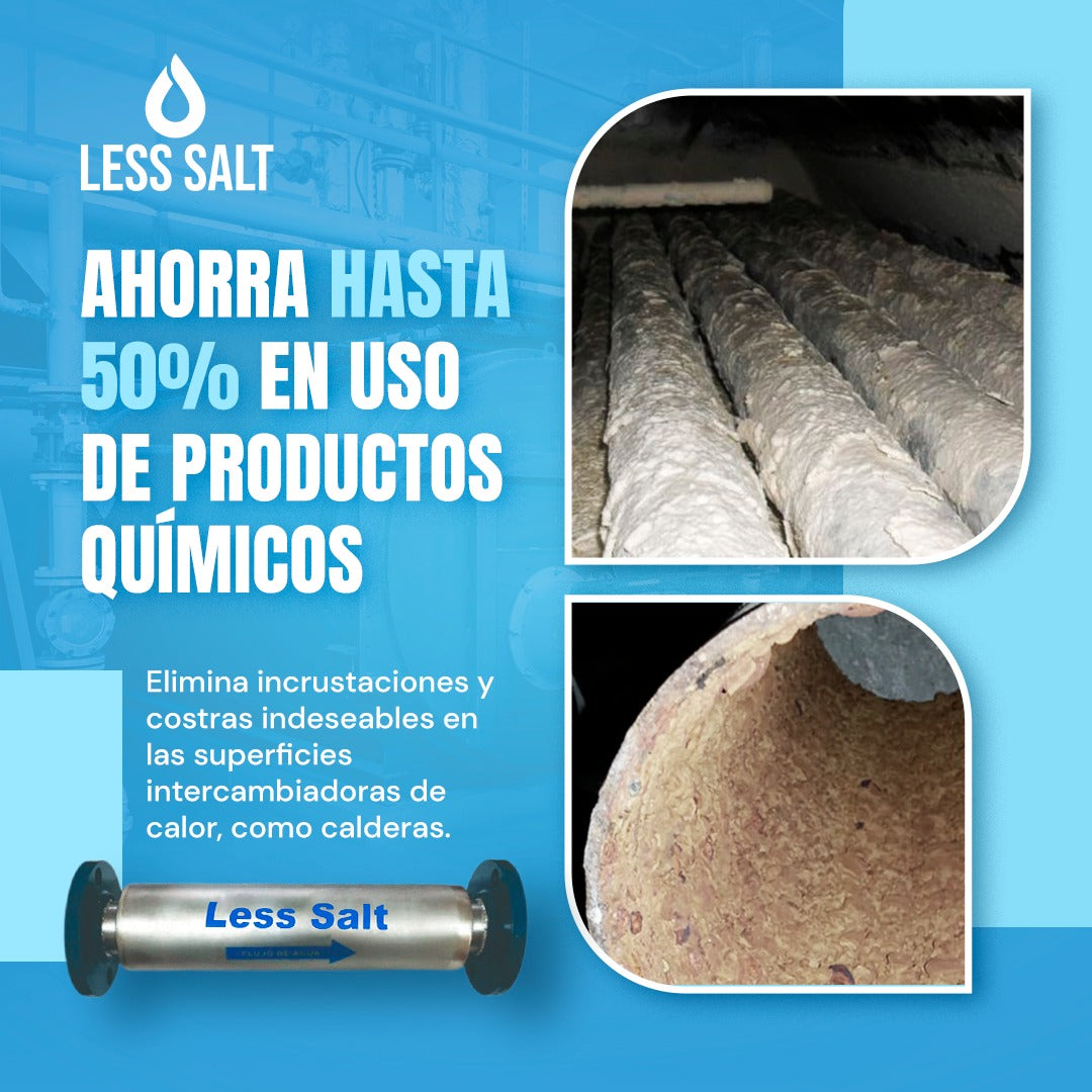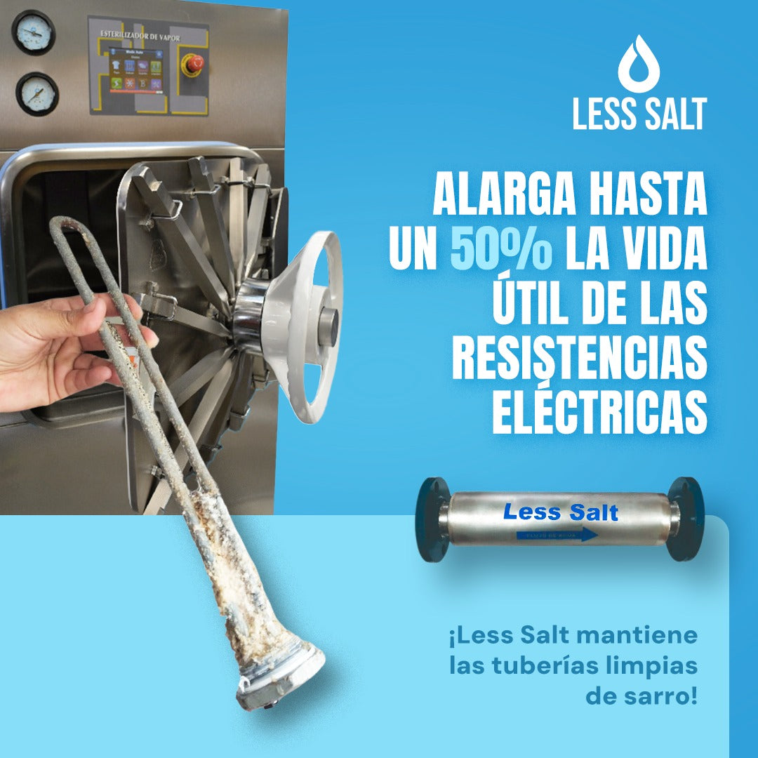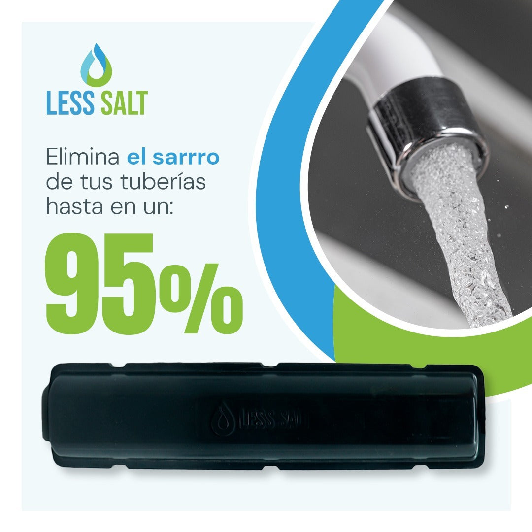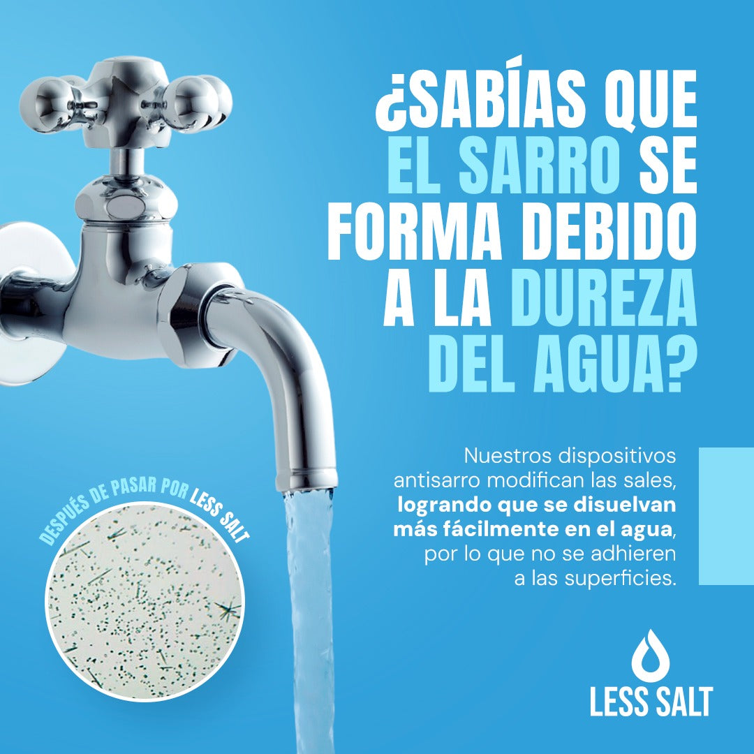 La tecnología de Less Salt actúa sobre el agua al pasar por el equipo magnético, modificando el tamaño de las sales disueltas en el agua.