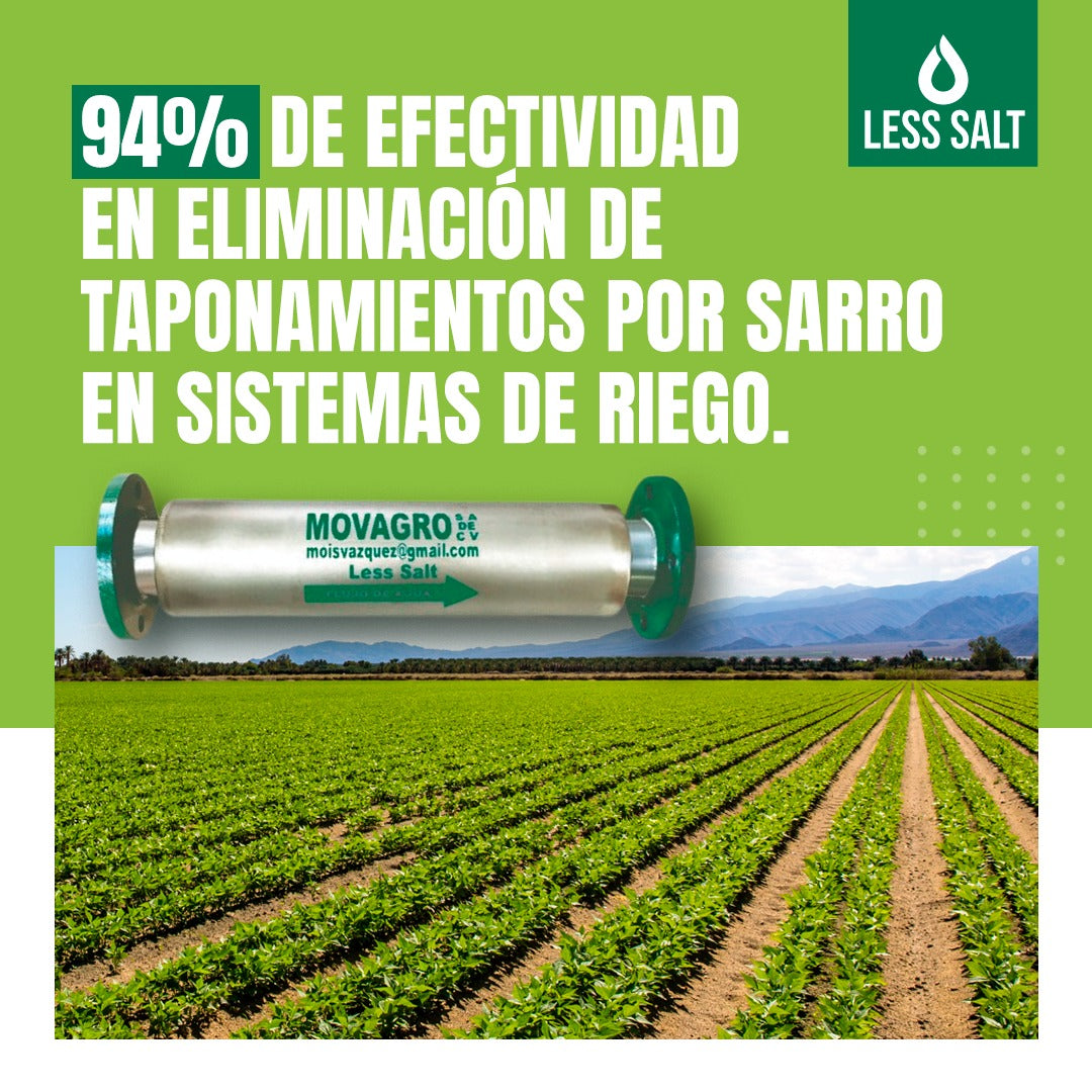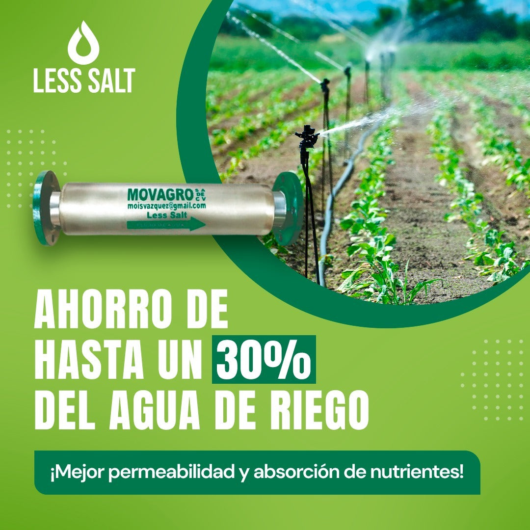 Less Salt es una solución magnética innovadora para el tratamiento del agua en la agricultura. Su sistema modifica las ventas disueltas en el agua, evita incrustaciones en sistemas de riego y mejora la absorción de agua y nutrientes por parte de los cultivos.